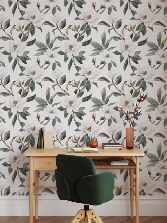 Green and White Magnolia Wallpaper